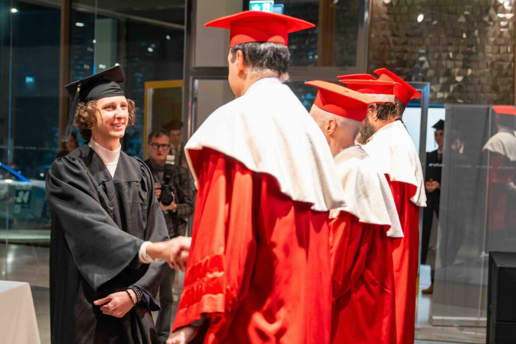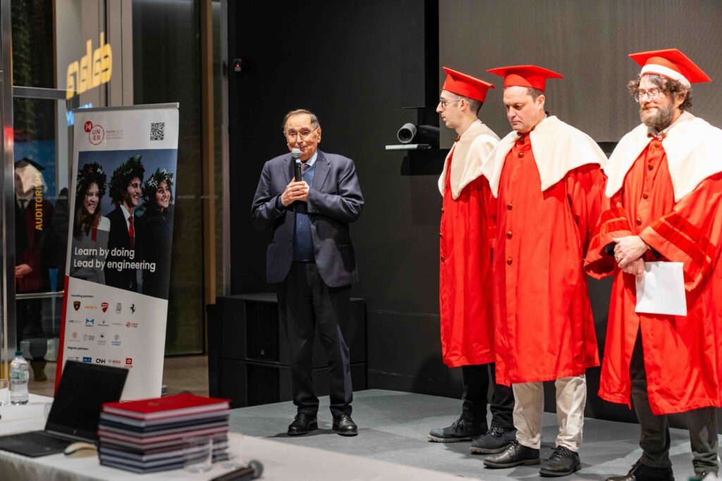 During the proclamation ceremony, Ing. Giampaolo Dallara addressed the graduates with an inspiring message, underlining how Italian universities stand out for their ability to educate highly versatile engineers, thanks to the strong foundations provided during their academic education. His words resonated deeply with the values at the core of MUNER’s mission.