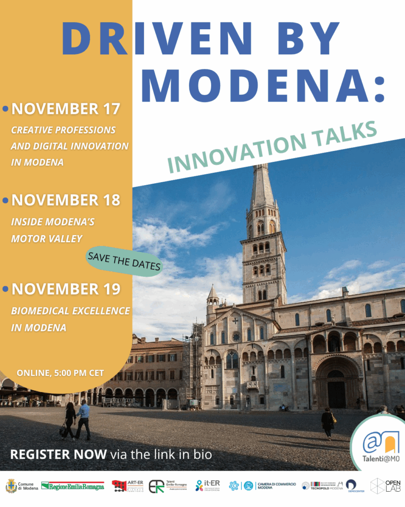 Driven by Modena: Innovation Talks is a three-day series of webinars exploring the innovative spirit that drives Modena’s most dynamic sectors — from creativity to mobility to life sciences.